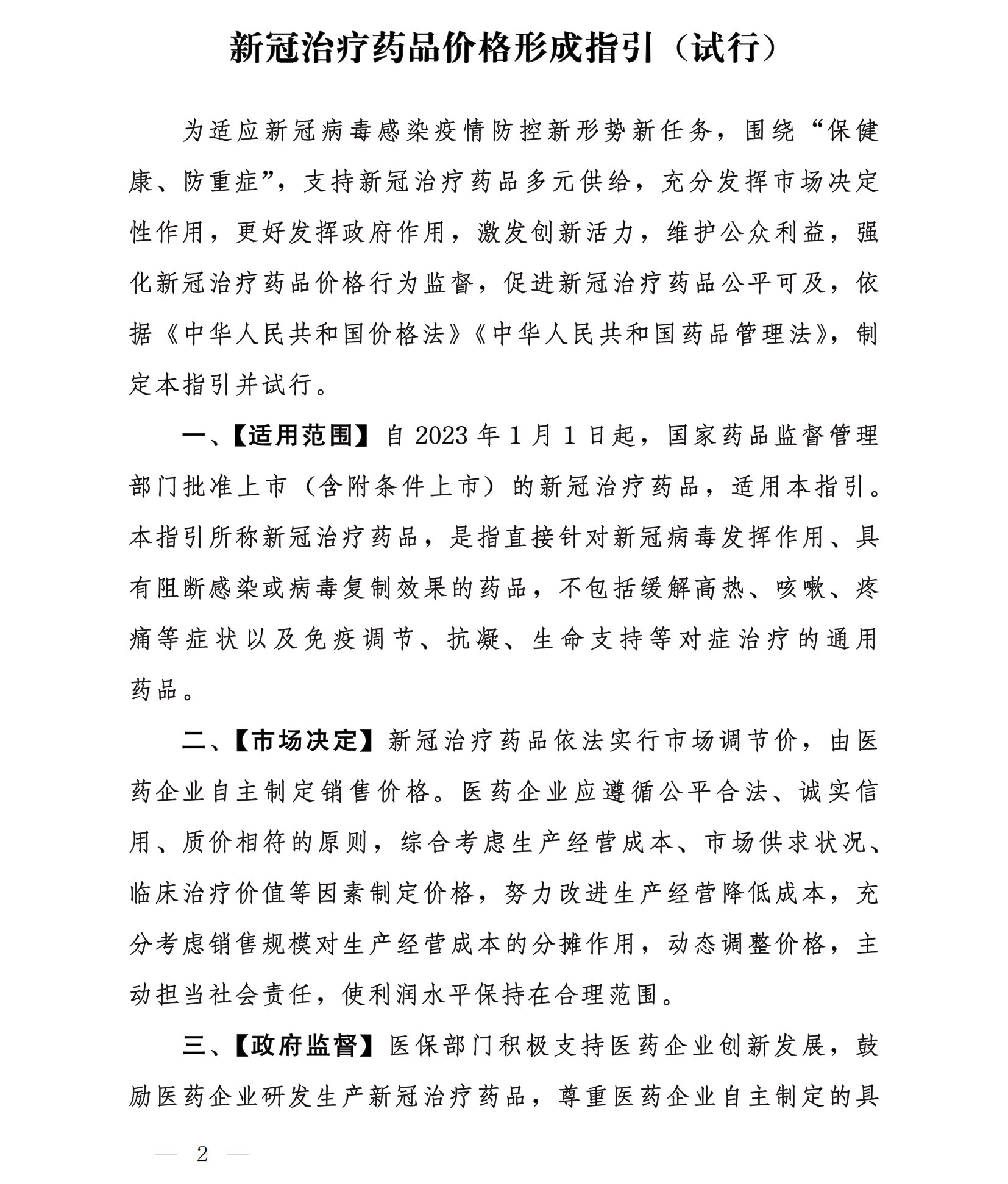 国家医疗保障局办公室关于印发《新冠治疗药品价格形成指引(试行)》的通知
